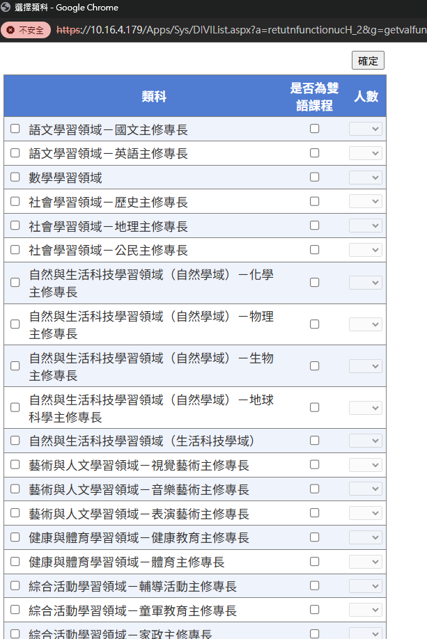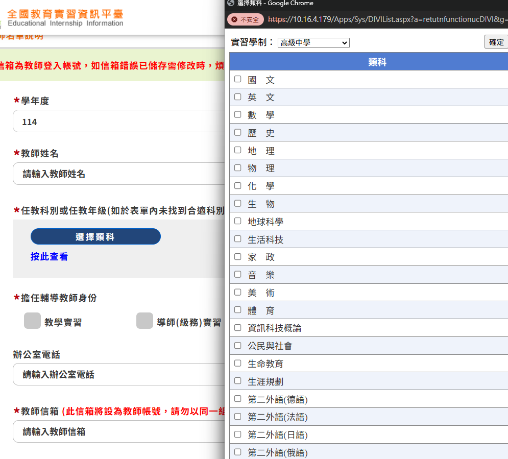 依據中等學校任教科別教師證書對照表調整全國教育實習資訊平臺類科選擇介面